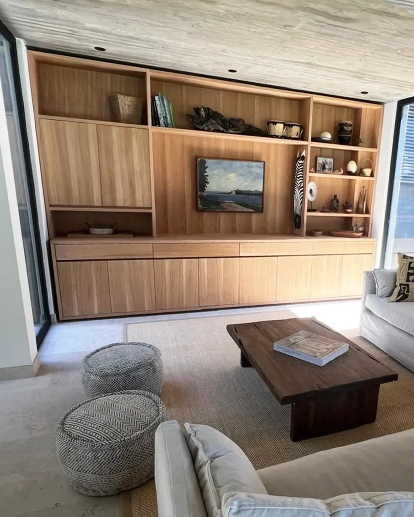 Este proyecto incluyó el diseño y fabricación de dos muebles de madera a medida, pensados para complementar y organizar espacios familiares. El primero fue un mueble organizador para la sala principal, diseñado con líneas limpias y acabados cálidos que se integran armónicamente con la decoración del ambiente. Su estructura contempla compartimentos cerrados y abiertos, permitiendo mantener el orden sin sacrificar la estética del espacio.