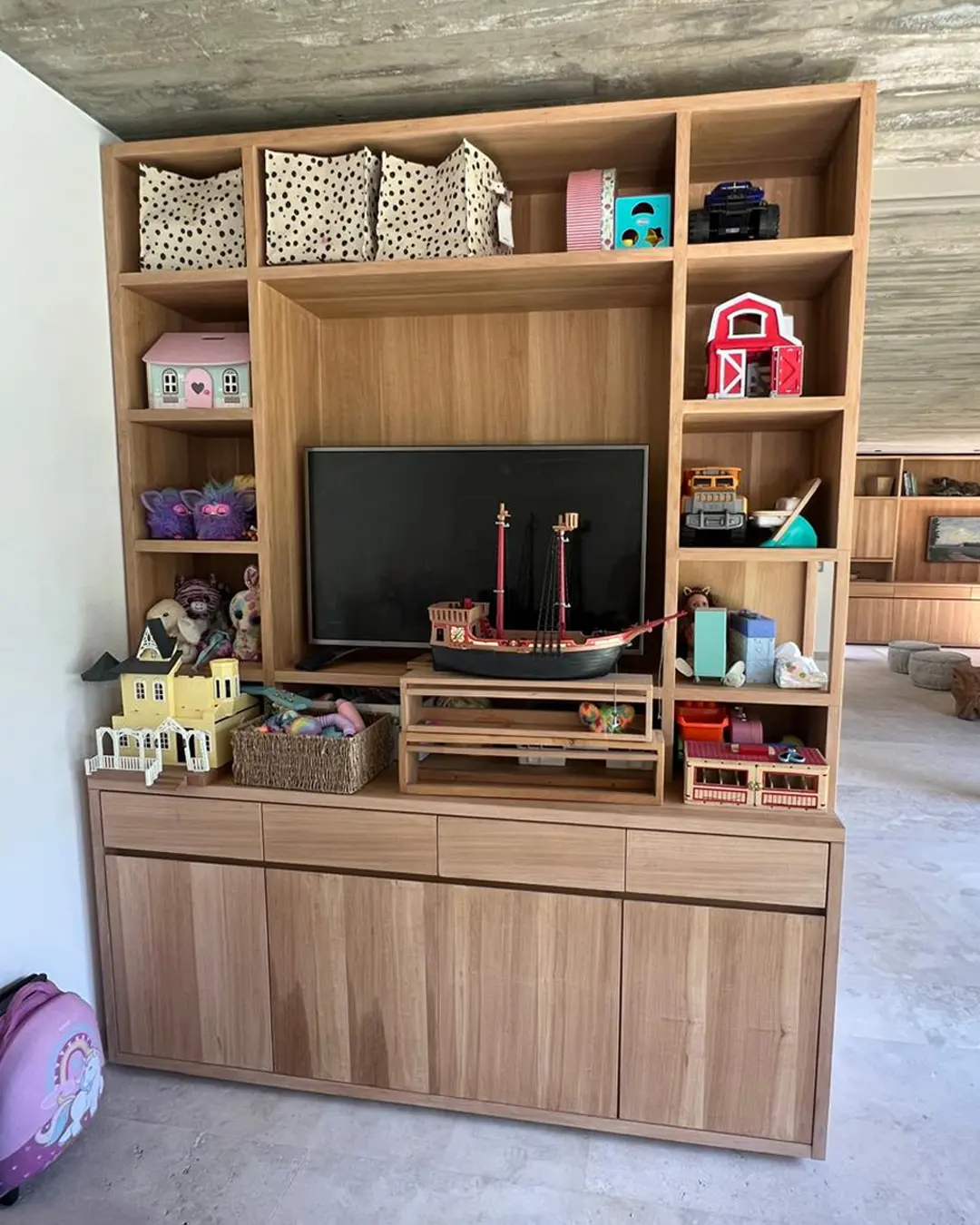 El segundo mueble fue desarrollado para una sala de estar secundaria con el objetivo de almacenar libros y juguetes. Se diseñó con un enfoque práctico y funcional, pensado para facilitar el acceso a niños y adultos, combinando estantes de distintas alturas y espacios versátiles.